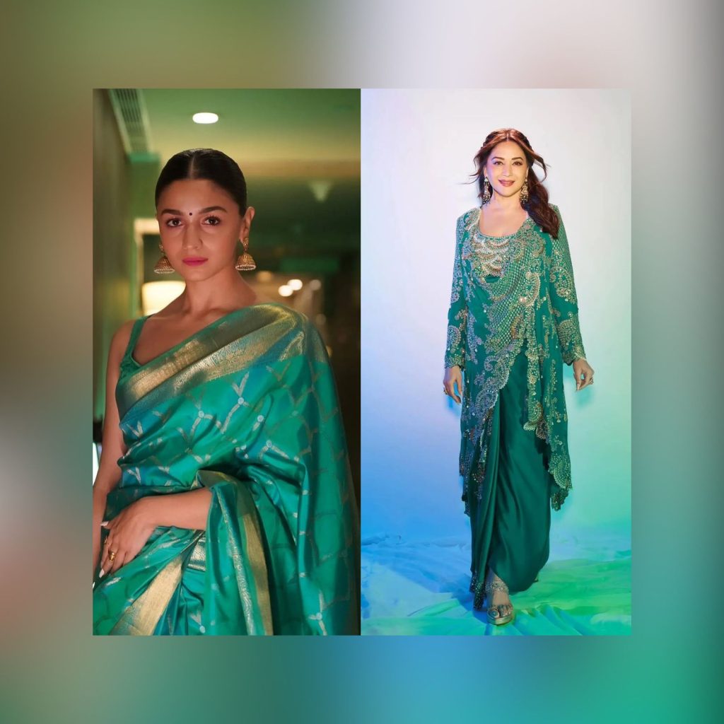 Madhuri Dixit show how versatile peacock green can be — Madhuri in a heavily embellished fusion dress with textured fabric that stands out under festive light.